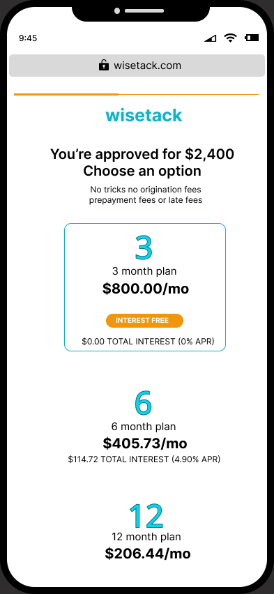 *All financing is subject to credit approval. Your terms may vary. Payment options through Wisetack are provided by our lending partners. For example, a $1,000 purchase could cost $45.18 a month for 24 months, based on a 7.9% APR, or $333.33 a month for 3 months, based on a 0% APR. See additional terms at http://wisetack.com/faqs.